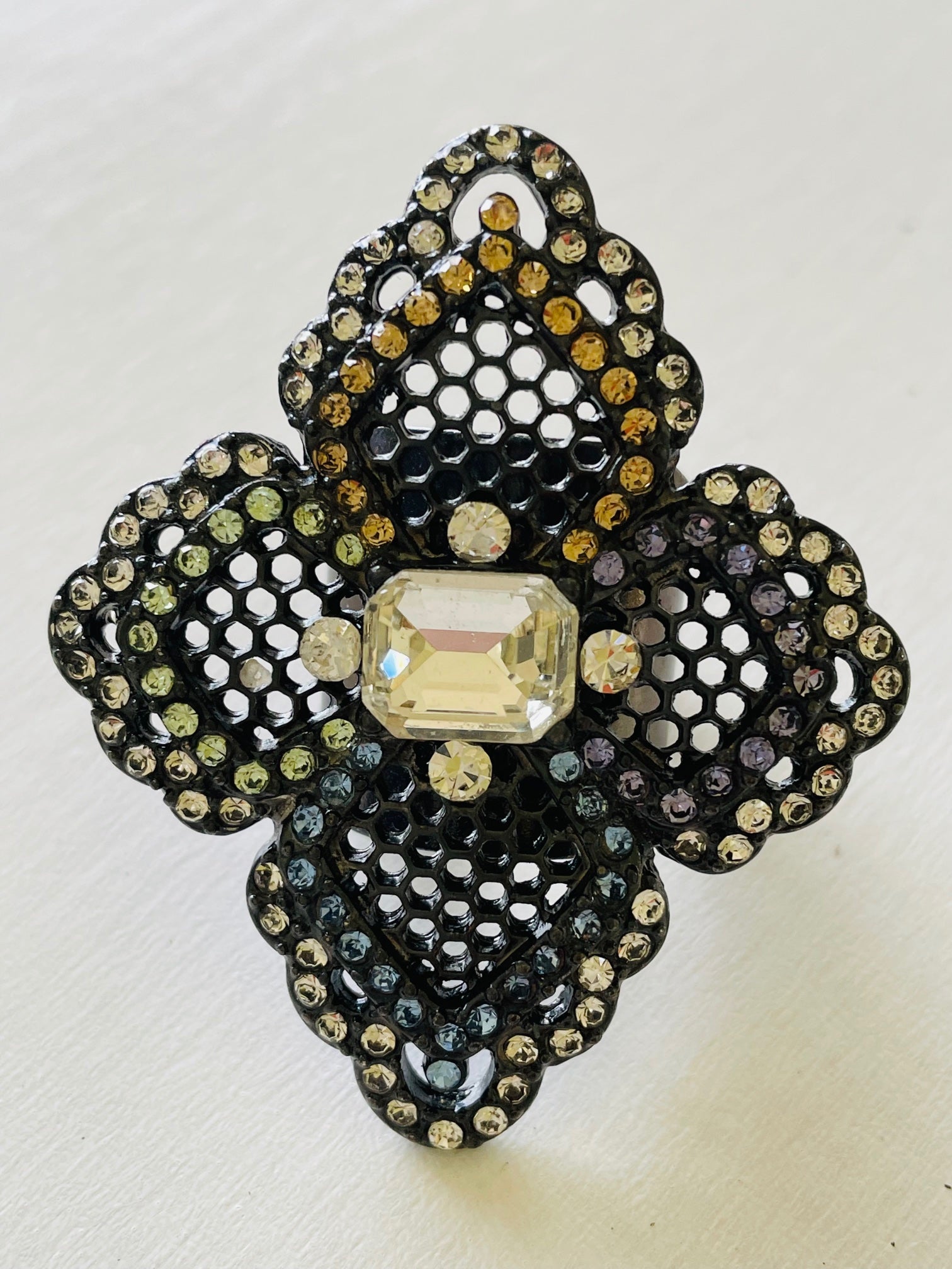 A beautiful multi-coloured flower ring with lovely filigree detail in the petals. The ring is adjustable and made from quality nickel-free electroplated brass. The widest part across the flower is approximately 45 mm and the height is approximately 52 mm,