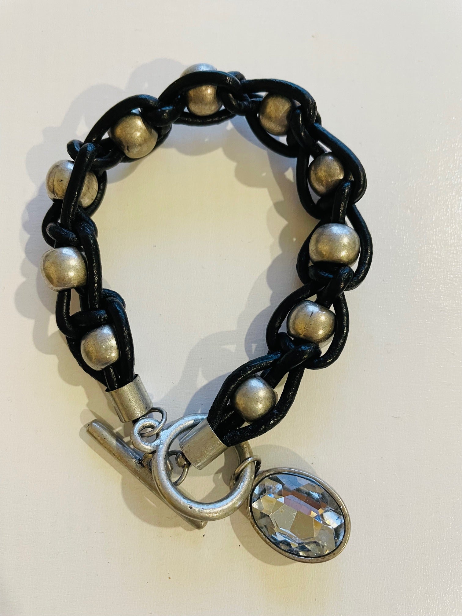 The black polythene woven through the silver beads makes this a very unique bracelet that will compliment any outfit. The crystal charm adds a touch of feminity. Has a fob clasp for ease of putting on and taking off.