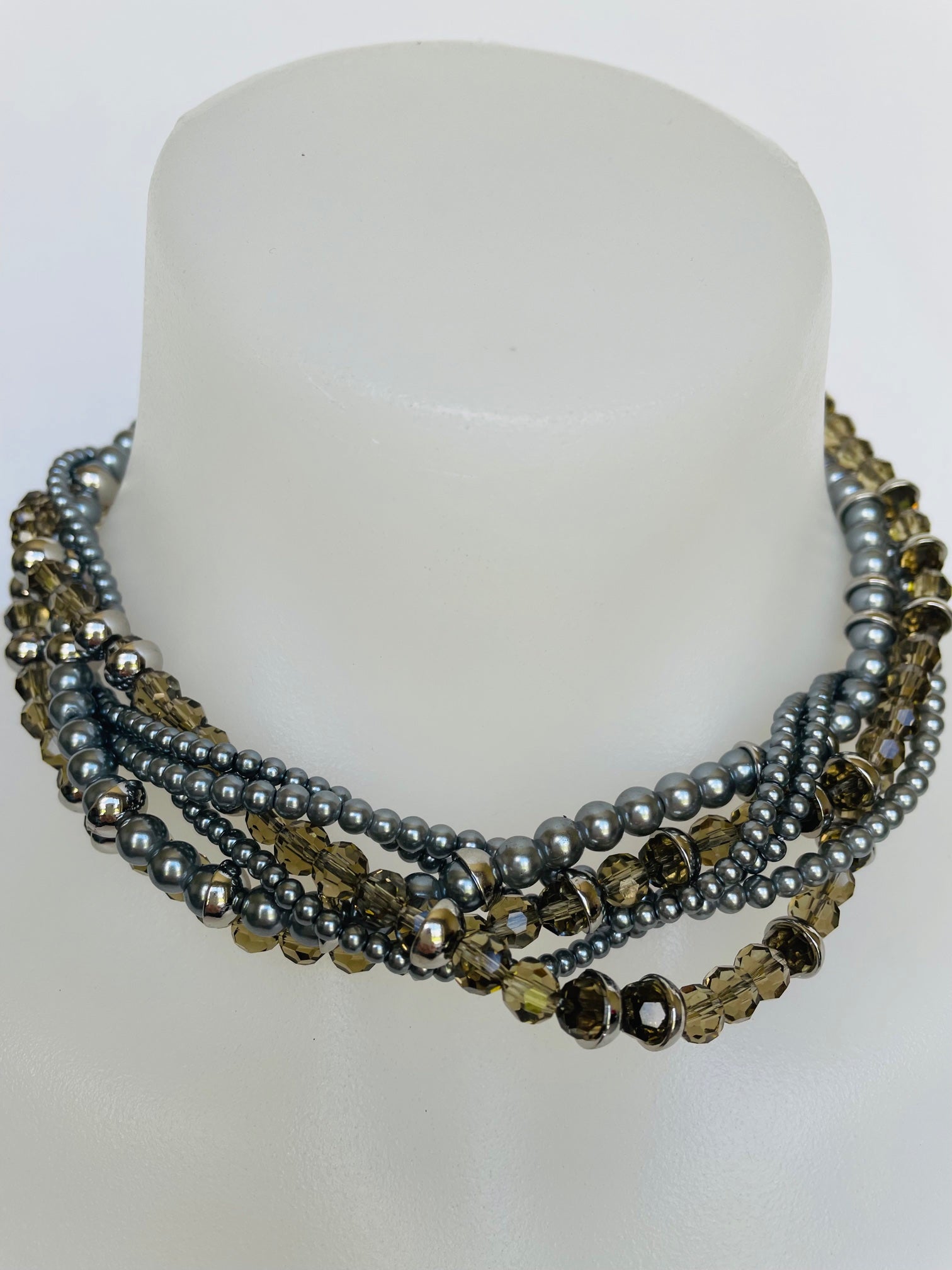 The necklace is made with multiple entwined strands of grey pearls and beads. The neutral tones will look perfect with almost any outfit.