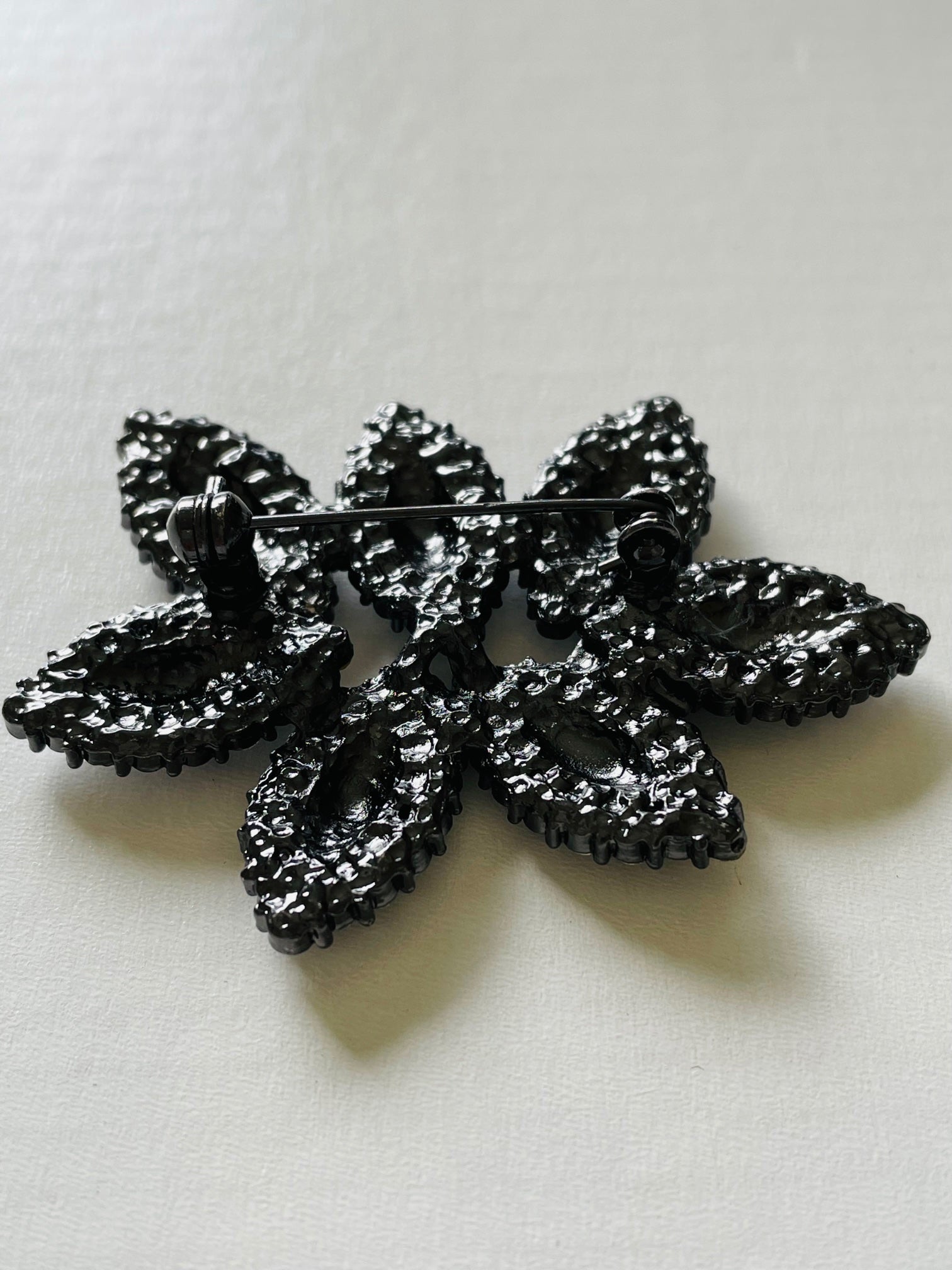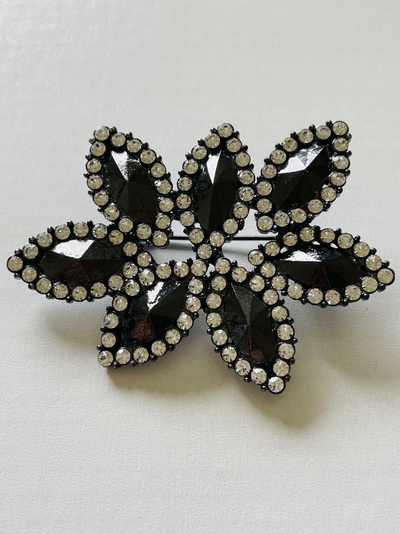 The sparkles in this brooch add glamour and sophistication!! The brooch has a quality clasp and is made from quality nickel-free electroplated brass. The width of the widest part of the brooch is approximately 60 mm and the height is approximately 45 mm.
