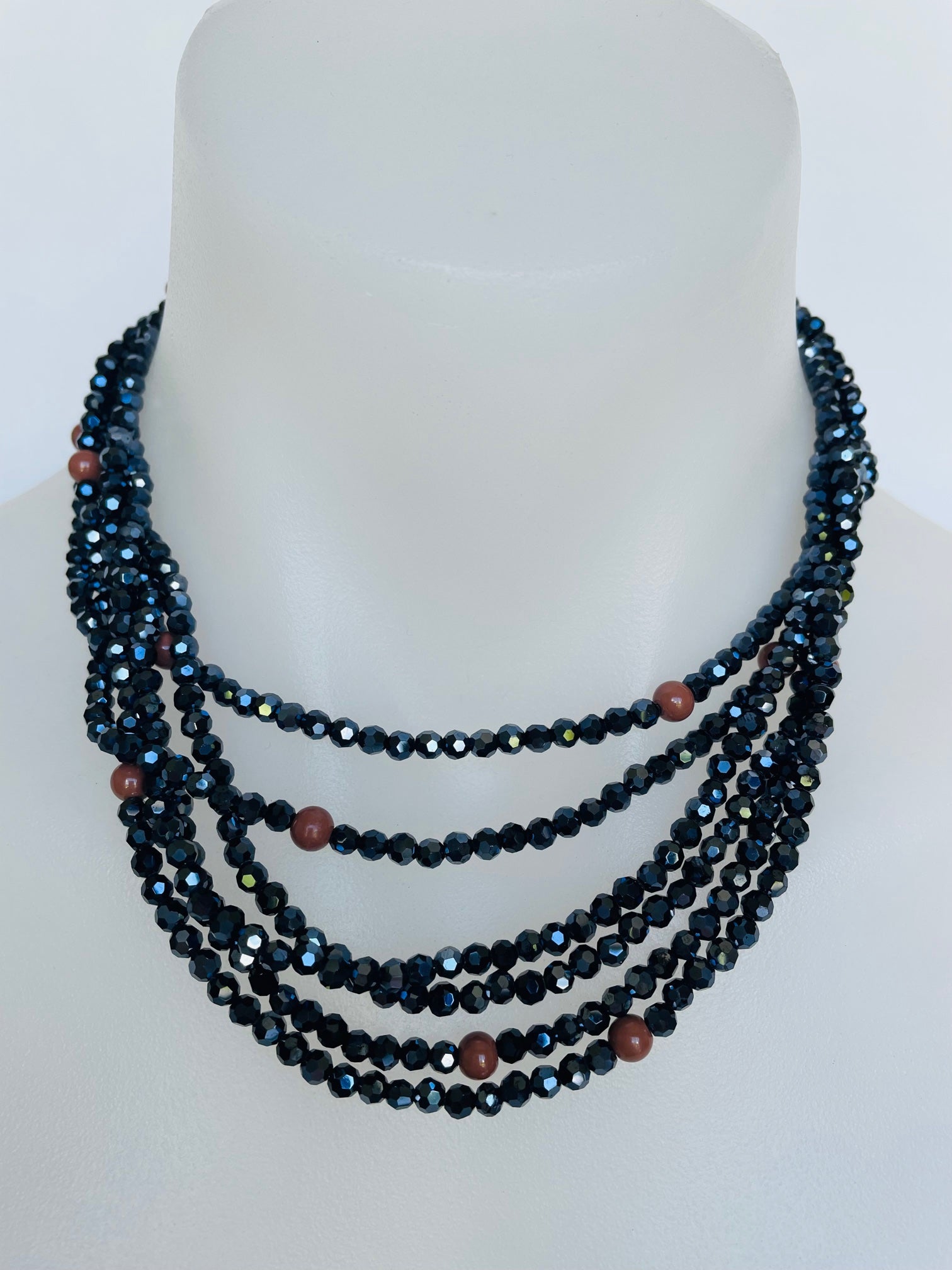 The necklace is made with multiple entwined strands of midnight blue crystals and coffee coloured beads. The neutral tones will look perfect with almost any outfit.