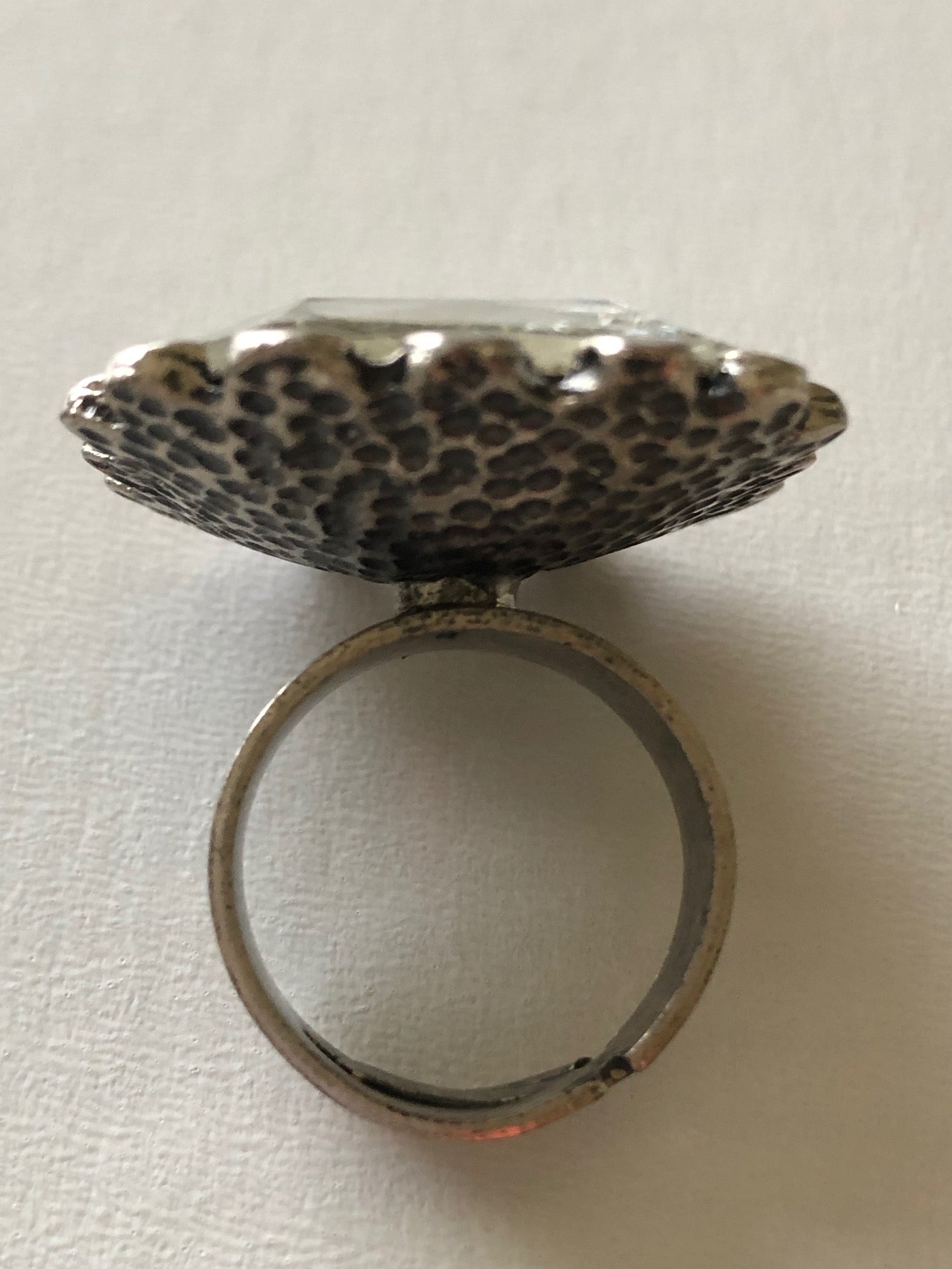 Beautifully detailed frill rim surrounding a large square crystal. The ring is adjustable and made from quality nickel-free electroplated brass. Width of crystal 30 mm, the height from the bottom base of the ring to the top of the crystal 29 mm. The ring size is adjustable.